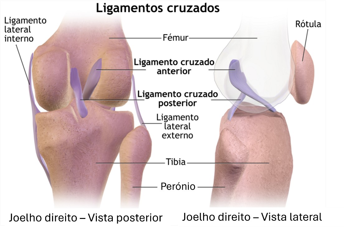 Os ligamentos cruzados são estruturas essenciais do joelho responsáveis pela sua estabilidade. Localizados no interior da articulação, o ligamento cruzado anterior (LCA) e o posterior (LCP) cruzam-se em forma de “X” e controlam o movimento entre o fémur e a tíbia, especialmente em ações como correr, saltar ou mudar de direção. Quando ocorre, por exemplo, uma rotura do LCA, verifica-se um aumento da translação anterior da tíbia em relação ao fémur, descrito clinicamente como “movimento de gaveta anterior”, indicativo de instabilidade articular.