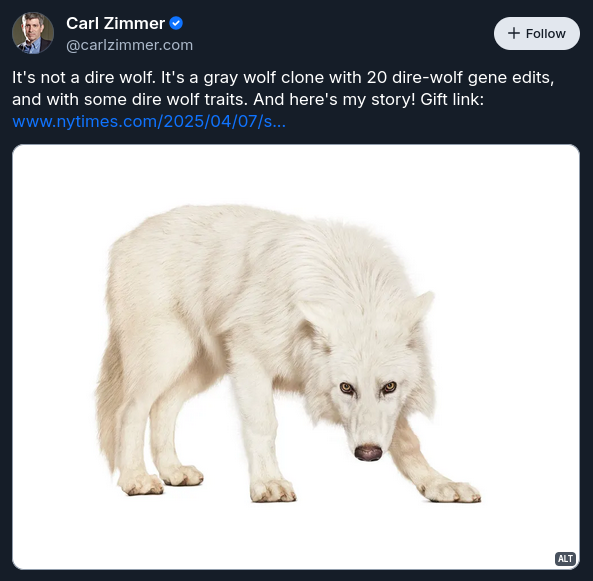 “Não é um lobo-terrível. É um lobo cinzento com 20 edições de genes de lobo terrível, demonstrando então traços de lobo terrível. (…)” – Carl Zimmer (via BlueSky, foto via Andrew Zuckerman.)