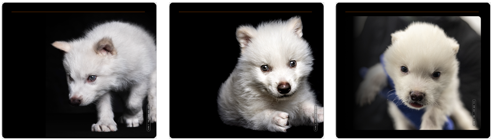 Remo, Rómulo (machos) e Khaleesi (fêmea), respectivamente, com 6 meses de idade (via Colossal Biosciences).