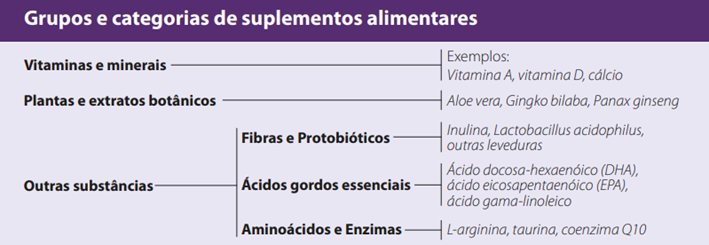 Os suplementos alimentares são, segundo o Decreto-lei 136/2003, “[…] géneros alimentícios que constituem uma fonte concentrada de substâncias nutrientes, as quais são apresentadas como complemento aos nutrimentos ingeridos num regime alimentar normal.”. Estes são tomados, de modo doseado, sob a forma de comprimidos, cápsulas, líquidos, saquetas de pó, entre outros, e contêm ingredientes como minerais, aminoácidos, vitaminas, enzimas e extratos de plantas. De acordo com um estudo português, do Instituto Superior de Agronomia, da Universidade de Lisboa, os ingredientes que mais prevalecem nos rótulos do mercado nacional de suplementos nacionais são: plantas/extratos (56%) e vitaminas/minerais (23%). Assim, conclui-se que estes fazem parte de dois dos três grandes grupos que integram os suplementos (discriminados na seguinte tabela:).